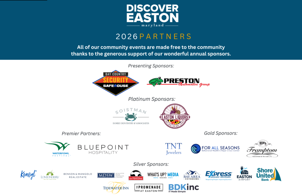 There is street parking as well as several downtown parking lots in Easton. Below is the link to the Town of Easton’s parking information. If you reference the parking map, lot 1 is closed for the event as well as S Harrison Street from Dover Street to South Street. We would recommend parking in lot 2, 5, or 3. https://www.eastonmd.gov/255/Parking